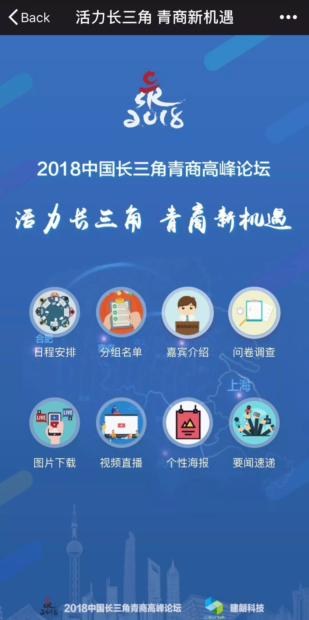 上海建朗信息科技有限公司設(shè)計(jì)制作“活力長(zhǎng)三角,青商新機(jī)遇”2018中國(guó)長(zhǎng)三角青商高峰論壇H5頁(yè)面。