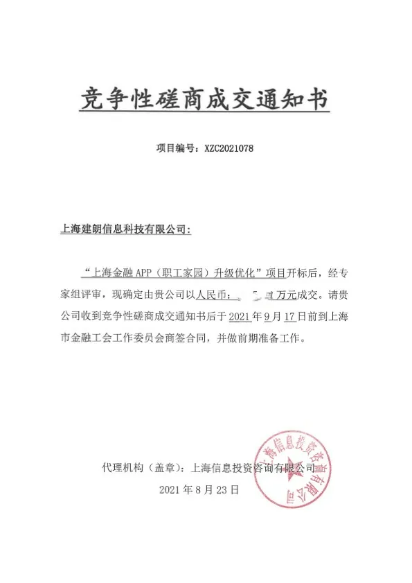 熱烈祝賀上海建朗信息科技有限公司于2021年08月23日在參與《“上海金融APP(職工家園)升級優(yōu)化”》項目中,憑借卓越的行業(yè)競爭力與優(yōu)質(zhì)的服務成功中標,再一次被選定為上海市金融工會“金融APP職工家園”的供應商;公司將更加有信心提供上乘的技術(shù)能力,更好的服務客戶。
