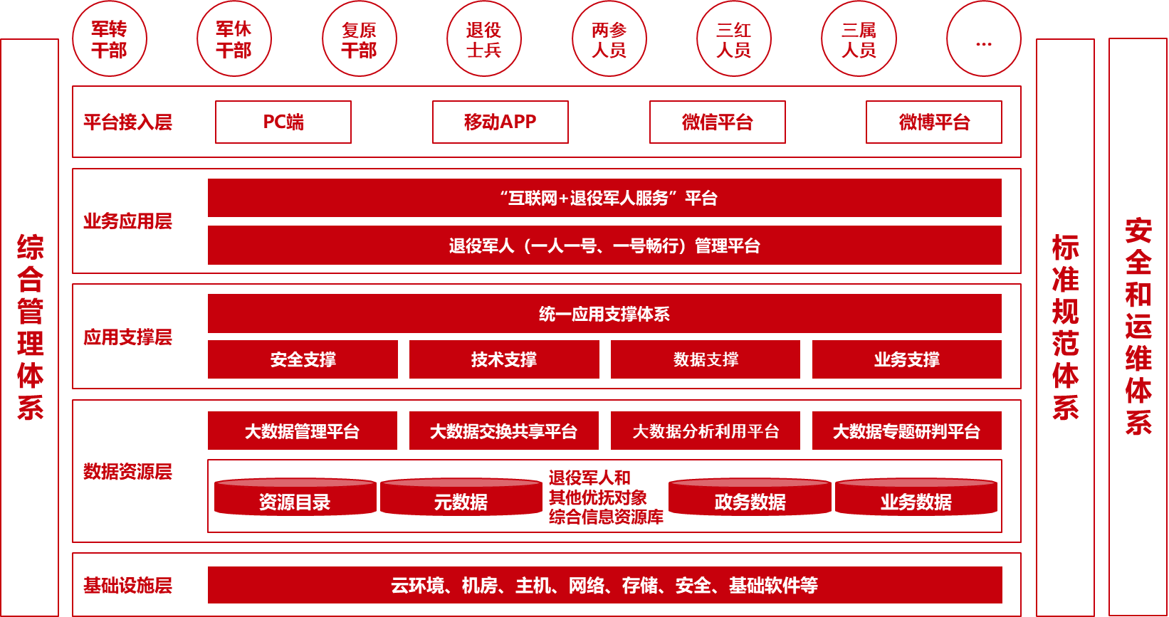 本方案基于堅(jiān)持服務(wù)導(dǎo)向、統(tǒng)籌規(guī)劃、問(wèn)題導(dǎo)向、融合創(chuàng)新、安全可控的建設(shè)原則,以整合匯聚數(shù)據(jù)、強(qiáng)化管理保障、多級(jí)業(yè)務(wù)協(xié)同、精細(xì)精準(zhǔn)服務(wù)、先進(jìn)安全可靠為建設(shè)目標(biāo),建設(shè)“統(tǒng)一、智慧、融合、便捷、可靠”的退役軍人事務(wù)信息化體系,最終形成“八大體系、五橫三縱”的總體格局。