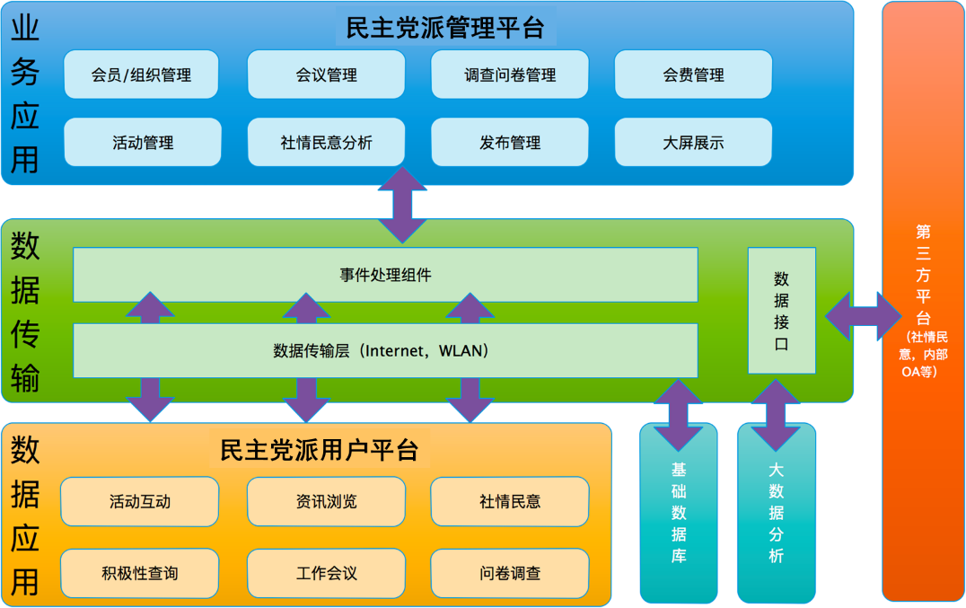本方案通過參考民主黨派各相關政策文件,結(jié)合具體黨派特色,構(gòu)建了一套聯(lián)通各級組織的信息管理與服務系統(tǒng)。該系統(tǒng)將分為數(shù)據(jù)應用、數(shù)據(jù)傳輸、業(yè)務應用三部分,并與基礎數(shù)據(jù)庫、大數(shù)據(jù)分析工具和第三方平臺打通,在保障傳統(tǒng)功能應用的同時,進一步幫助民主黨派提高自身管理、宣傳、服務水平,充分提升民主黨派干部工作效率,加強組織間聯(lián)動,打通互動交流渠道,豐富民主黨派成員活動,全面賦能基層組織工作。