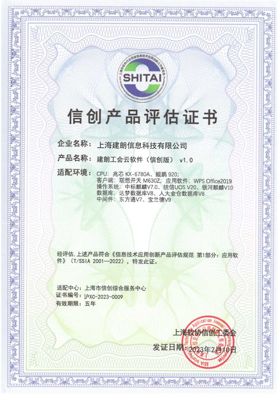 上海市經(jīng)濟和信息化委員會2020年度上海市軟件和集成電路產業(yè)發(fā)展專項資金項目(軟件和信息服務業(yè)領域)——基于國產軟硬件環(huán)境的網(wǎng)上工會平臺項目已順利完成專項驗收,建朗工會云產品獲得上海軟件協(xié)會信創(chuàng)工委會頒布的信創(chuàng)產品評估官方認證。