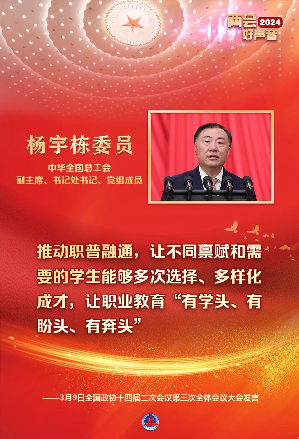 中華全國(guó)總工會(huì)副主席、書記處書記、黨組成員楊宇棟委員代表全國(guó)總工會(huì)作大會(huì)發(fā)言。楊宇棟委員表示,產(chǎn)業(yè)工人是工人階級(jí)的主體力量,是創(chuàng)造社會(huì)財(cái)富的中堅(jiān)力量,是創(chuàng)新驅(qū)動(dòng)發(fā)展的骨干力量,是發(fā)展新質(zhì)生產(chǎn)力的重要力量。中共二十大強(qiáng)調(diào)要培養(yǎng)造就更多大國(guó)工匠、高技能人才。中共中央、國(guó)務(wù)院于2017年印發(fā)《新時(shí)期產(chǎn)業(yè)工人隊(duì)伍建設(shè)改革方案》,7年來一系列保障產(chǎn)業(yè)工人主人翁地位的制度政策出臺(tái)落地,一支高素質(zhì)產(chǎn)業(yè)工人隊(duì)伍逐漸壯大,全國(guó)技能勞動(dòng)者超過2億人,其中高技能人才超過6000萬人。但與推動(dòng)高質(zhì)量發(fā)展、加快形成新質(zhì)生產(chǎn)力的要求相比,技能人才總量不足、結(jié)構(gòu)不合理、技崗不匹配、職業(yè)獲得感不強(qiáng)的問題仍比較突出。為此,楊宇棟委員建議: